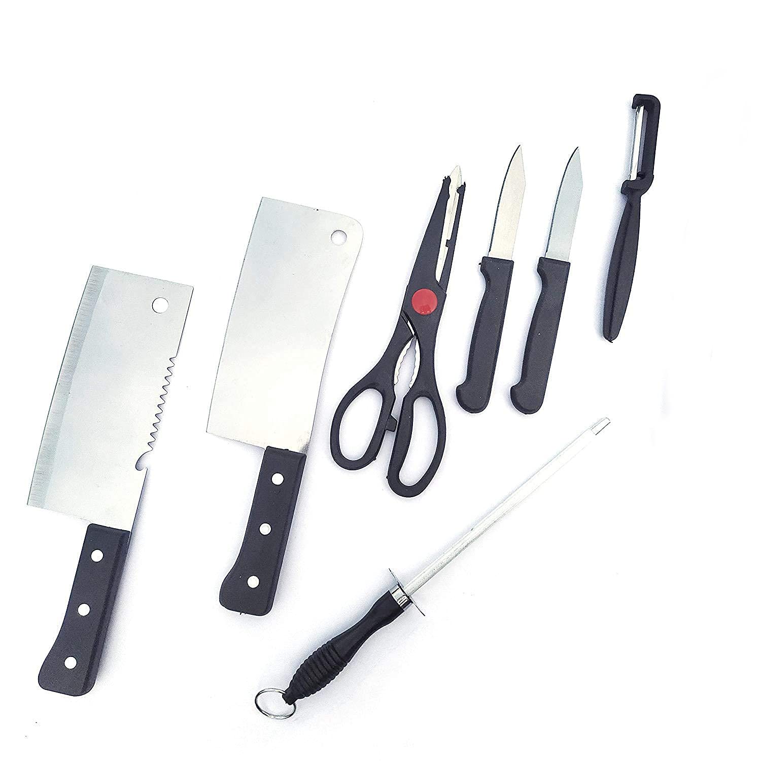 Ideal Accessory for Your Kitchen knife set will make a great addition to your kitchen. This set includes 7 knives, a pair of scissor. Made of high-quality materials, these pieces are sure to last for long. Superior-Quality Design The knives included come in various shapes and sizes. They have black plastic handles that provide a firm grip at all times.Hang the chopping board and scissors when not in use for convenient storage. Buy this kitchen knife set to cut vegetables, fruits and other food items with maximum ease.