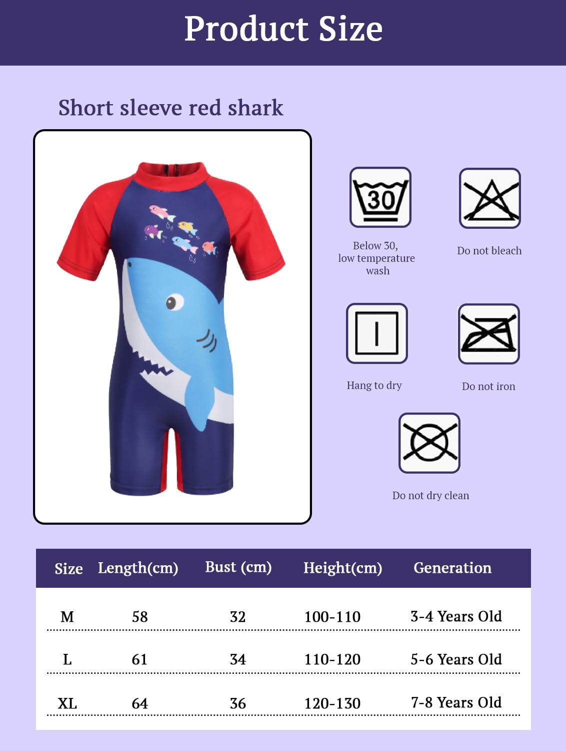 size: M (3-4 years old), L (5-6 years old), XL (7-8 years old)