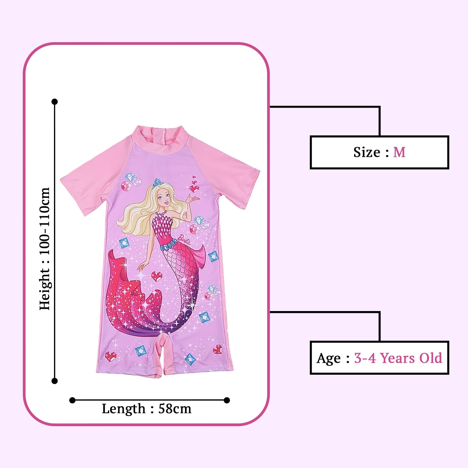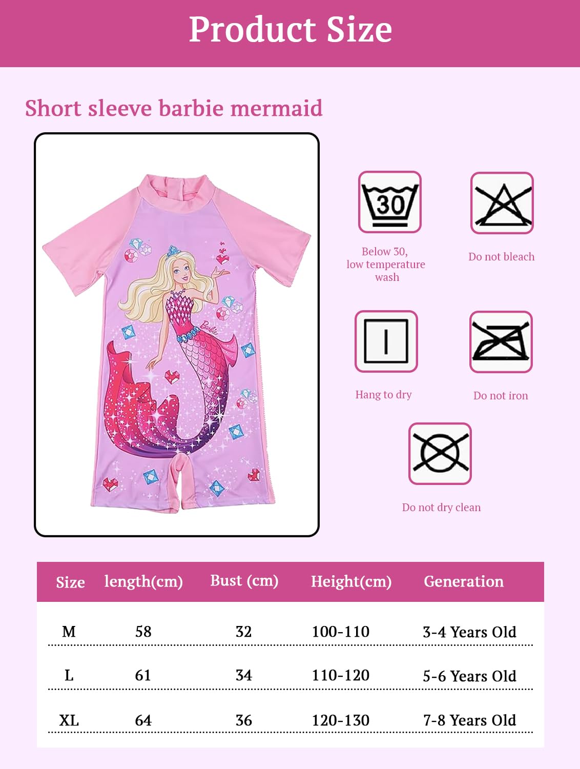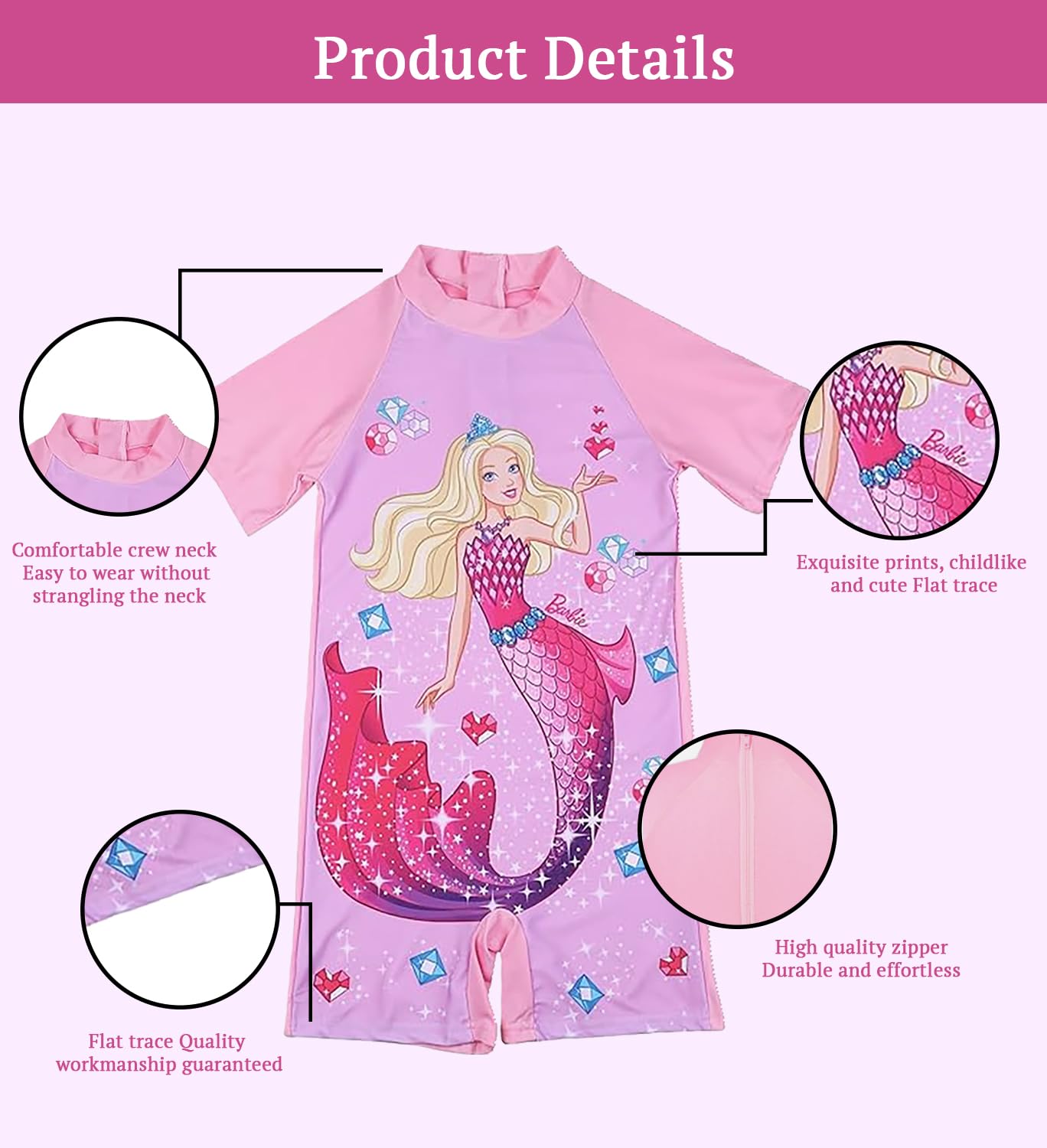 This cheerful children's swimsuit from SYGA is perfect for pretend play. The short sleeve top features a vibrant purple fabric with a sparkling mermaid print that any little girl is sure to love. The fitted rashguard design provides UPF 50+ sun protection while allowing freedom of movement in the water. Available in sizes for girls ages 3-8 years old, it has an elastic waistband for a comfortable yet snug fit. With its mermaid theme and rash guard protection, this swimsuit encourages hours of fun and imagination at the beach or pool without worry from parents. It's sure to become a favorite for pool parties or beach days this summer.
