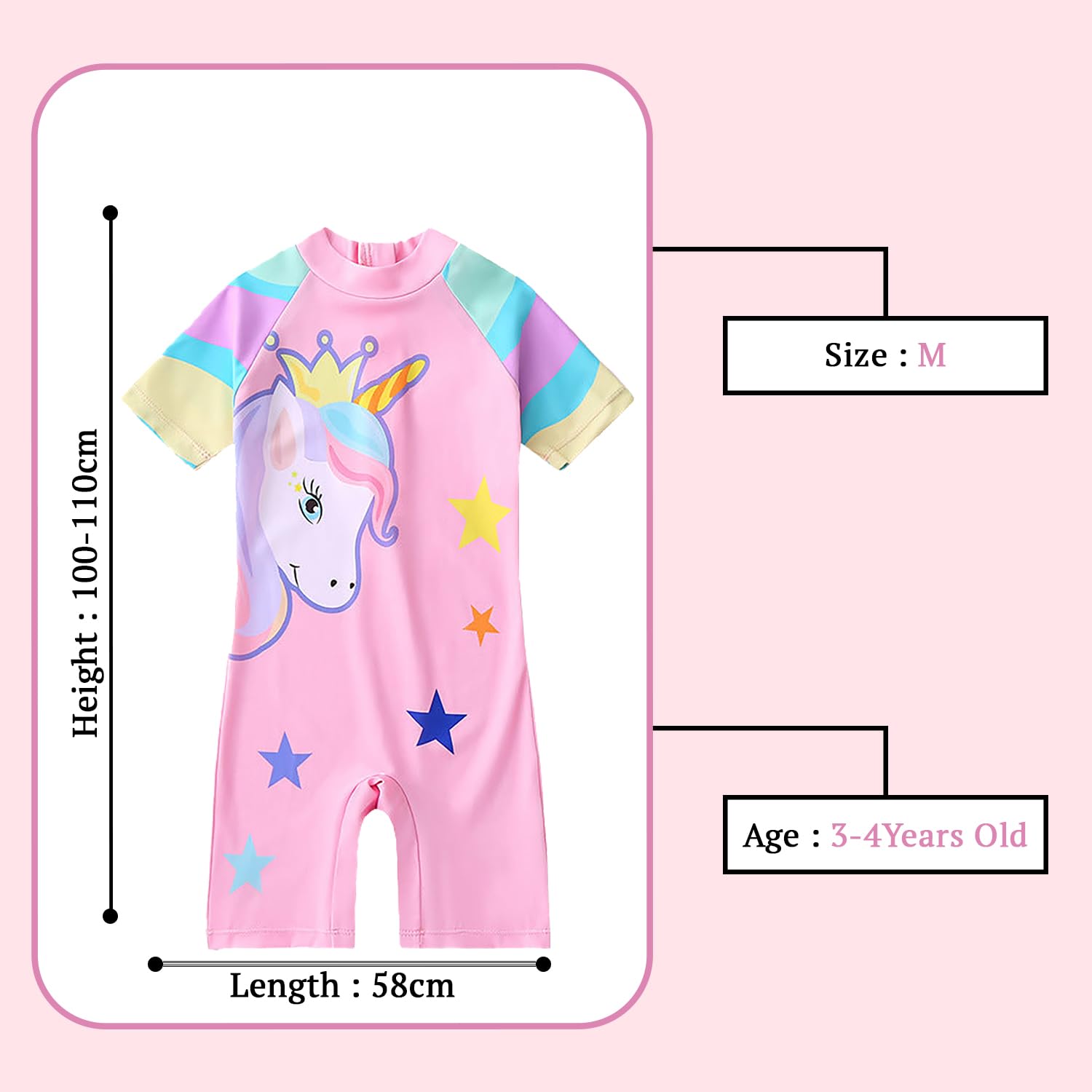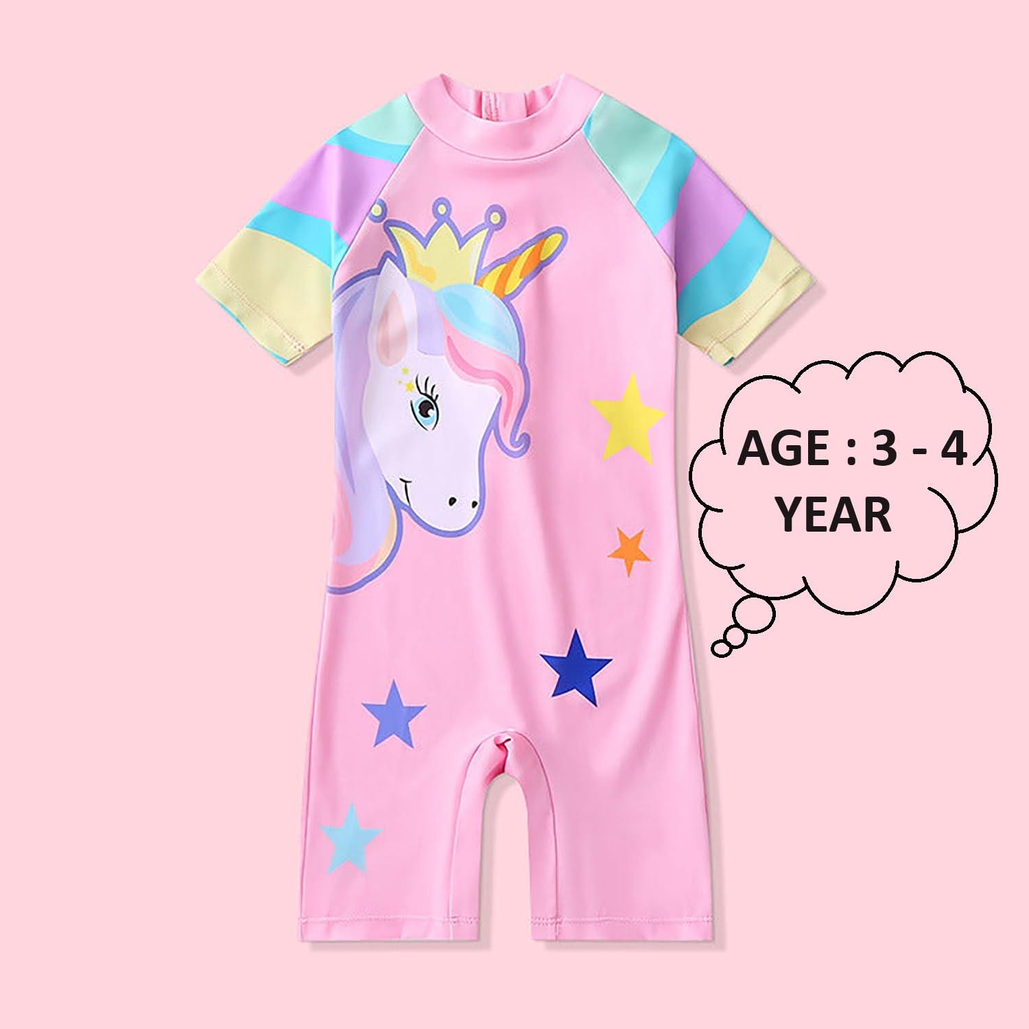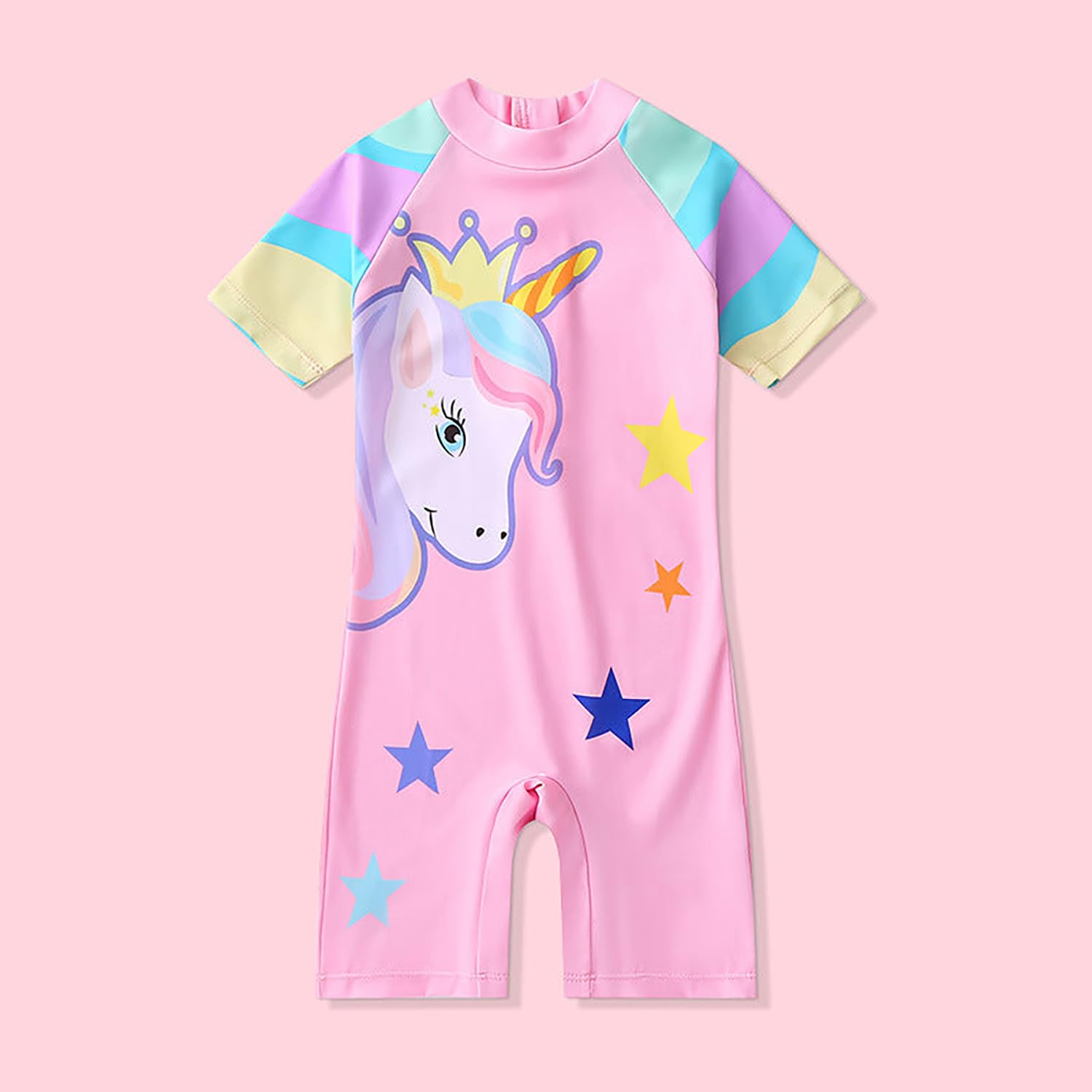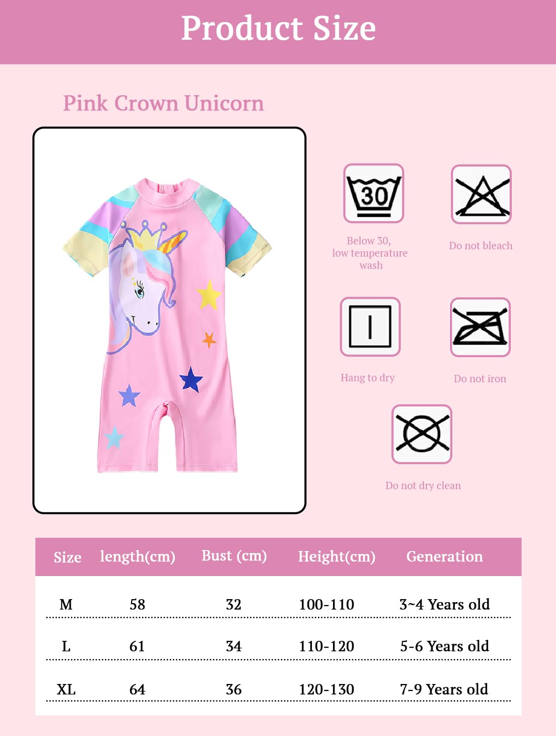 This adorable children's swimsuit is perfect for a fun day at the beach or pool. Featuring a pink unicorn design, young girls will love the magical theme of this one-piece suit. It comes in sizes for ages 3-4, 5-6, and 7-9 years old so she can wear it for several seasons. Made from quick drying material, the swimsuit has a rash guard style top that provides UV protection without sacrificing style. Sleeves and built-in shorts help keep her modest and comfortable in or out of the water. Snap closures make it easy for little ones to use the bathroom independently. With its eye-catching look and practical features, this swimsuit will become her new favorite for summer fun!