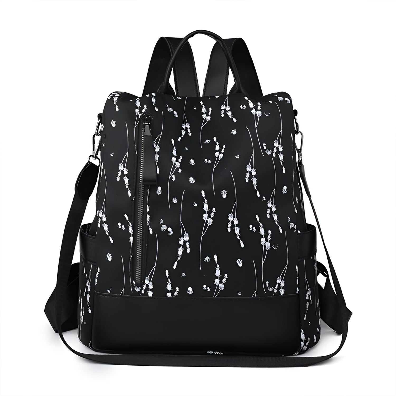 This elegant floral backpack is crafted from premium Oxford cloth, combining lightweight durability with a soft, water-resistant finish. Designed with a spacious main compartment, inner organizer pockets, and convenient external zip and side pockets, it keeps your essentials neatly arranged. The pastel base with delicate white floral prints adds a feminine, charming touch, while the faux leather detailing enhances its modern aesthetic. Perfect for casual outings, college, or travel, it blends fashion with functionality. Comfortable shoulder straps and a top handle ensure easy carrying. A thoughtful and stylish gift option, ideal for all occasions.