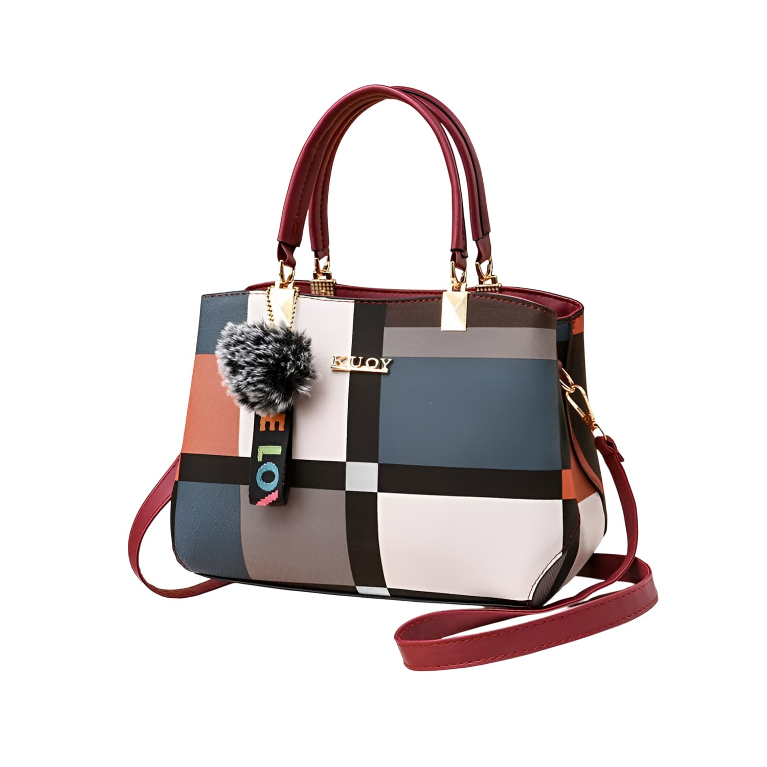 This stylish handbag features a modern plaid patchwork design, combining elegance with a contemporary touch. Crafted from high-quality PU leather, it offers a structured silhouette with reinforced handles and gold-tone hardware for a luxurious appeal. The bag includes a spacious main compartment with multiple interior pockets for organized storage. It comes with a detachable, adjustable shoulder strap for versatile carrying options—handheld, shoulder, or crossbody. Accentuated with a chic furry pompom and LOVE keychain charm, this bag adds a playful yet sophisticated vibe, making it perfect for daily use, work, shopping, or special occasions.