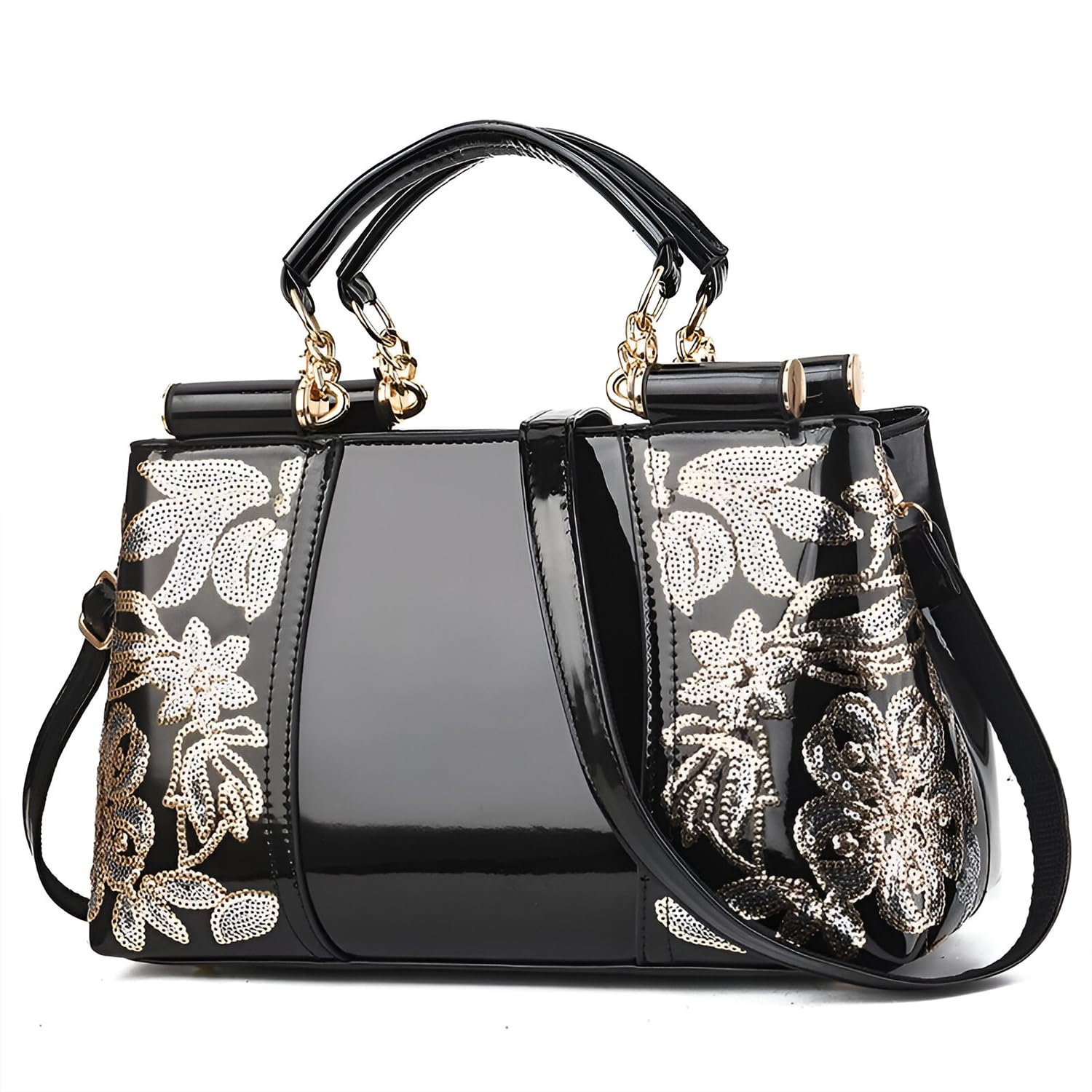 Elevate your style with this sophisticated SYGA women's handbag, crafted in a high-gloss navy blue patent PU leather exterior, beautifully adorned with intricate floral sequin embroidery. The premium double handles, detailed with gold-tone chain attachments, exude a refined elegance, perfectly complemented by the bag's sleek and structured silhouette. Designed for modern functionality, it features a spacious main compartment with a secure zipper closure, along with dedicated pockets for your phone, ID, and other daily essentials. The versatile design includes both sturdy top handles and a detachable, adjustable shoulder strap, allowing you to carry it comfortably as a handbag, shoulder bag, or crossbody. Ideal for both daytime elegance and evening sophistication, this handbag flawlessly blends chic style with everyday practicality.