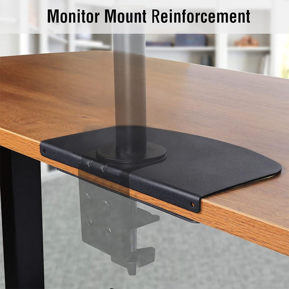 Details: Protect Your Fragile Tabletop with the Metal Monitor Mount Reinforcement Plate. Ideal for thin glass and other delicate tabletops, this protective plate provides stability and security for your monitor mount. Made from durable metal, it reinforces your tabletop while allowing for smooth and effortless installation of clamp or grommet based mounting solutions. Keep your workspace safe and secure with the Protective Plate for Metal Monitor Mount Reinforcement