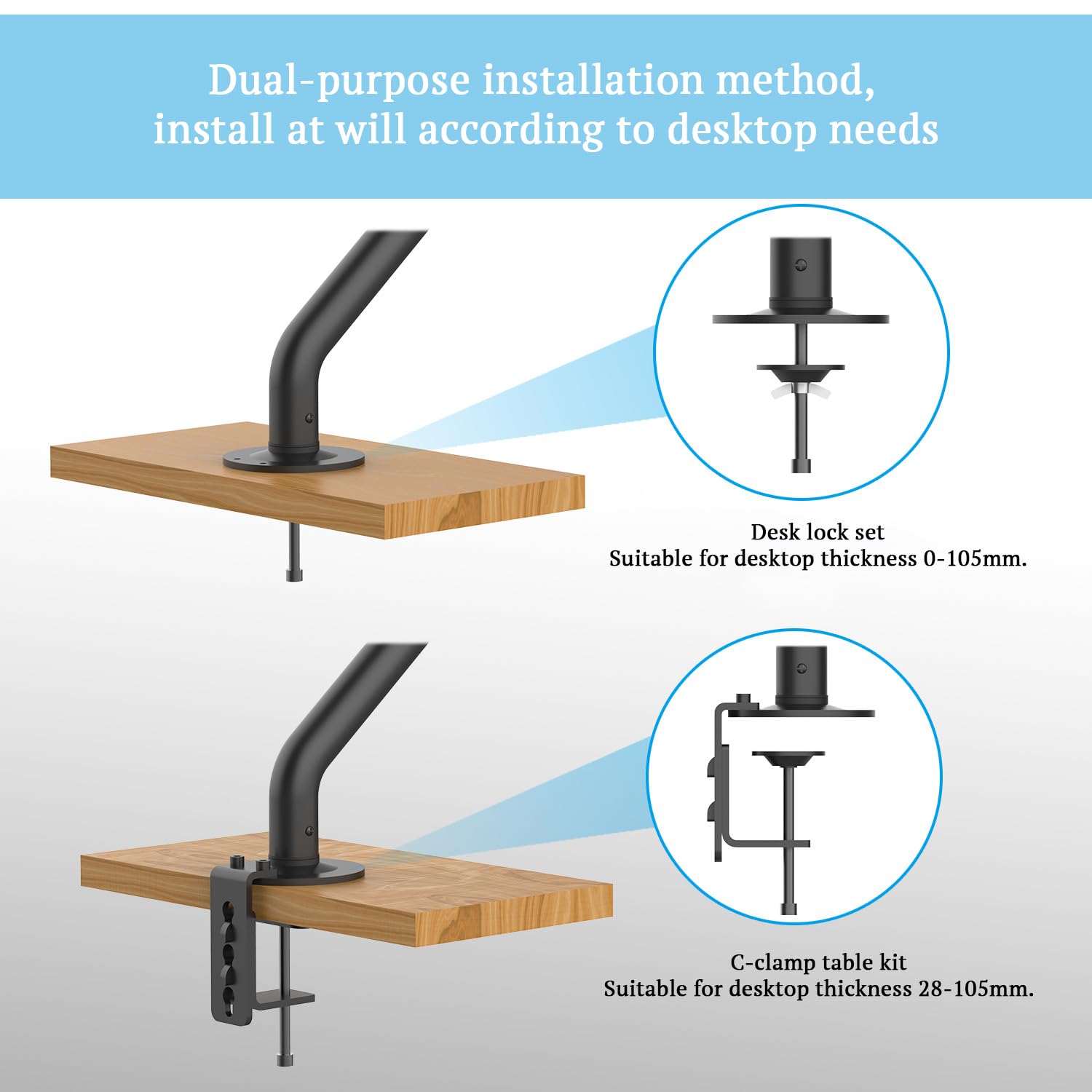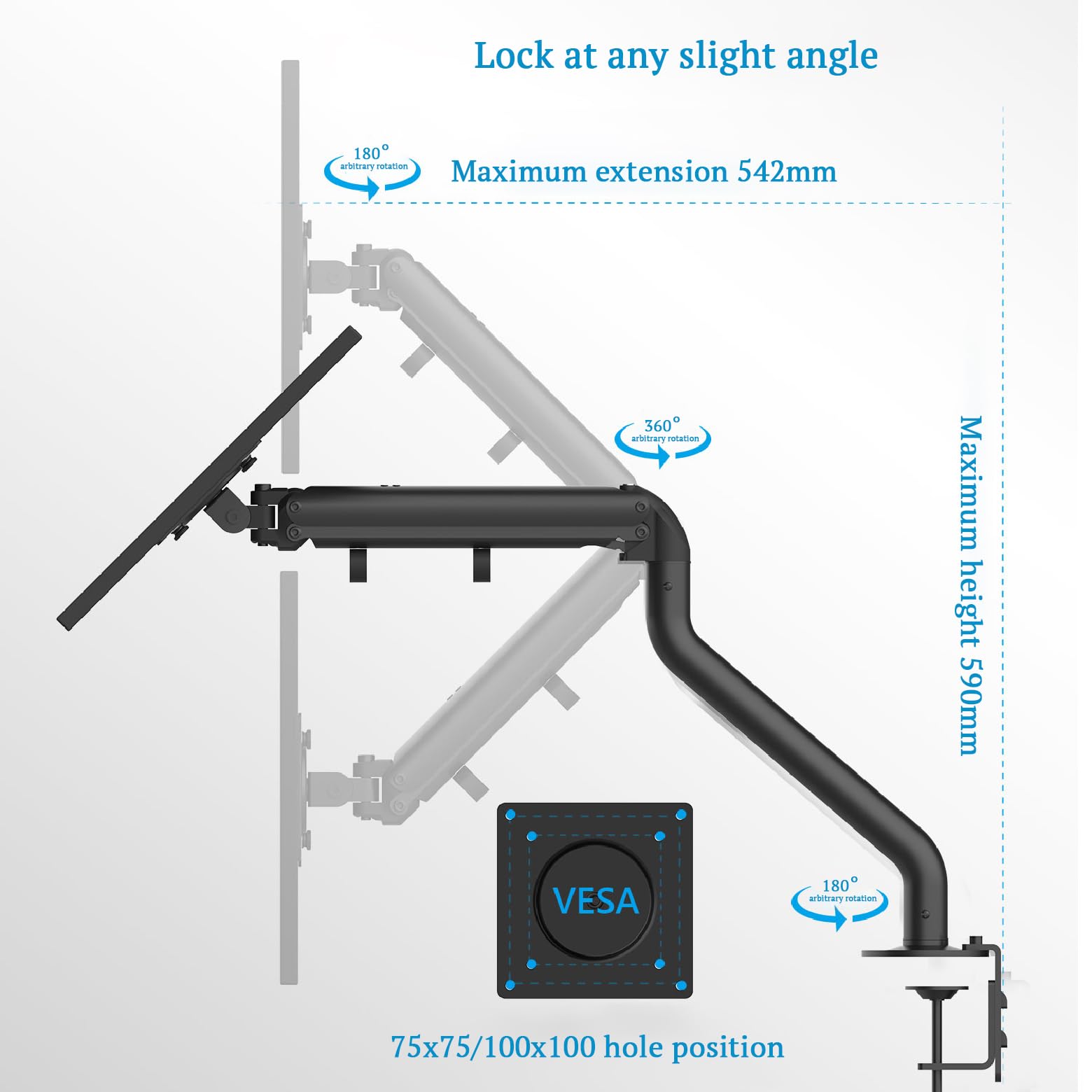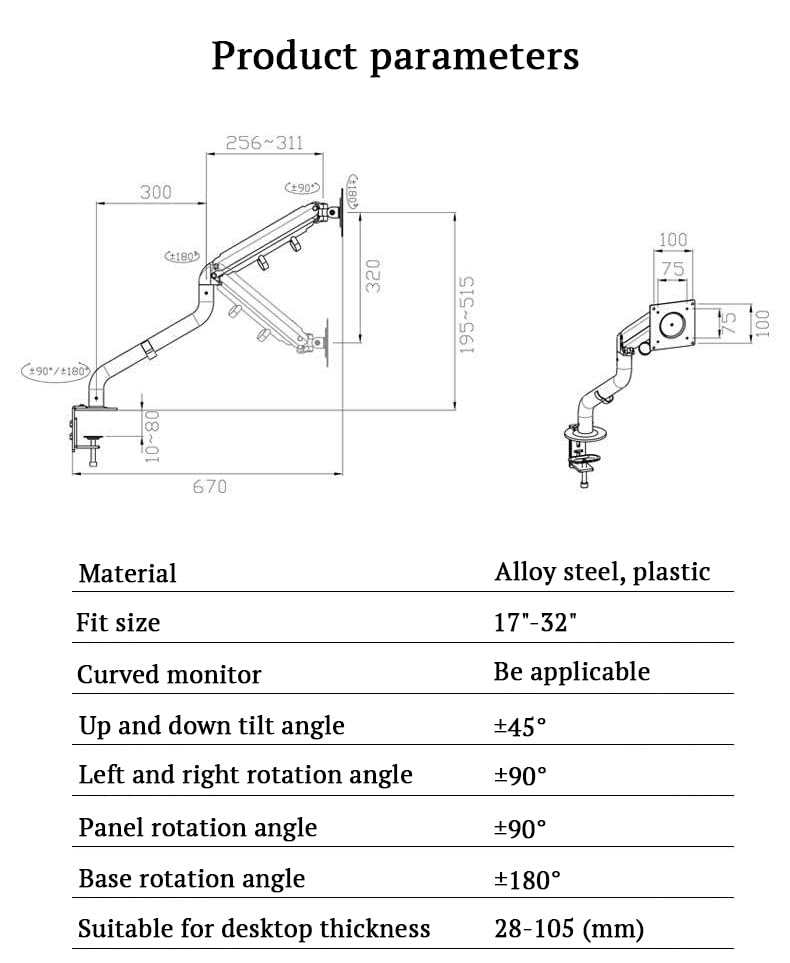 Details: This adjustable monitor stand allows you to position your screen for optimal viewing comfort. Made of durable steel with a black powder coated finish, this arm extends, raises and lowers to fit monitors between 17-32 inches. It attaches securely to your desk's edge or grommet holes through a strong C-clamp mount. Once installed, independently adjust the monitor height, tilt, pan and portrait/landscape position with ease using the gas spring controls. Cable clips and channels are included to keep your workstation tidy. Assembly is quick and tool-free. This flexible monitor arm promotes proper ergonomics and helps prevent neck, shoulder or back strain when used regularly at a computer workstation.